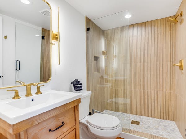 This bedroom is perfect for kids with a bunk bed that has a twin on top, full on the bottom, and a twin trundle. In addition, it has a private restroom that shares walk-in shower with Bedroom 2.