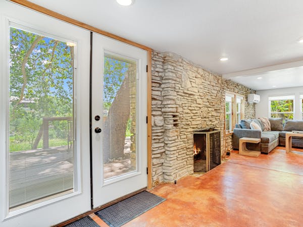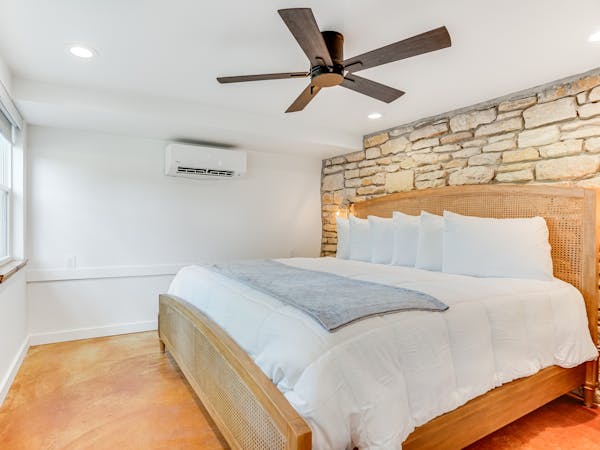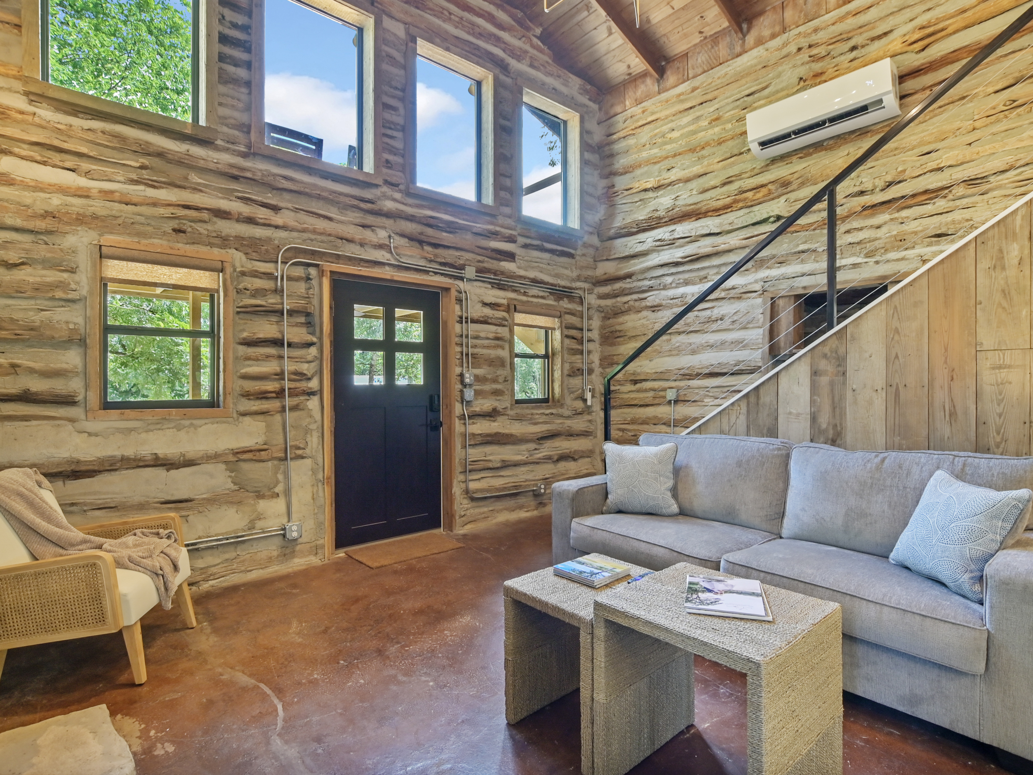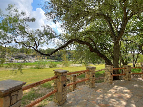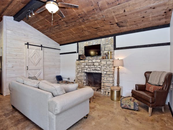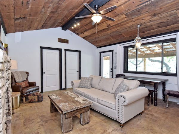 This historical rustic log cabin sleeps up to 8 guests and is nestled across the road from the banks of the Blanco River and Cypress Creek. Located on a private 34-acre resort, walking distance from the downtown square, you have access to almost 1/2 mile of waterfront. This cabin offers a fully furnished kitchen, smart TV, wi-fi, linens, walk-in shower, large screened-in porch with a bar and big screen, firepit and a charcoal BBQ pit. There are two bedrooms, one with 2 queens, the other with 2 twins, as well as a sleeper sectional sofa.