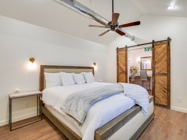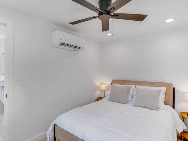 This bedroom has a cozy queen-size bed and a private restroom located just outside the door that shares a walk-in shower with Bedroom 3, Jack & Jill style.