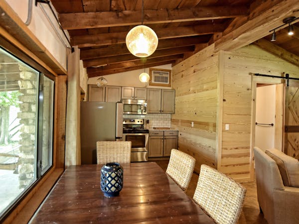 This gorgeous cabin is nestled across the road from the banks of the Blanco River and Cypress Creek in Downtown Wimberley and sleeps up to 4 guests. Located on a private, gated 34-acre resort walking distance from the downtown square, you have access to almost 1/2 mile of waterfront and all of the amenities of home. Recently remodeled, this cabin offers a fully furnished kitchen, TV, wi-fi, linens, walk-in shower, large patio with unbeatable views, and a charcoal BBQ pit.